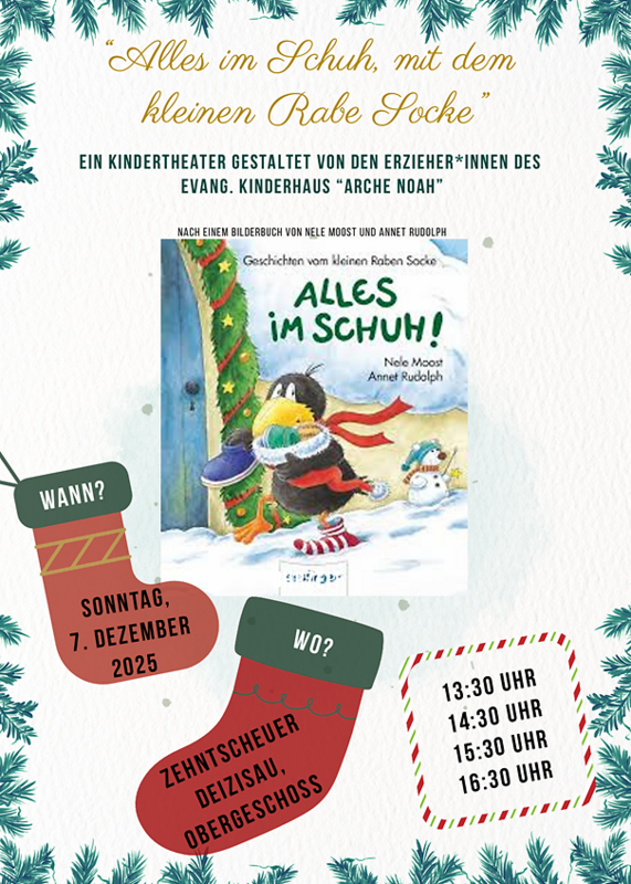Am 7. Dezember spielen wir Erzieherinnen und Erzieher in der Zehntscheuer ein besonderes Theaterstück. Der kleine Rabe Socke erfährt, dass der Nikolaus jedes Jahr kommt und den Tieren Mandarinen, Nüsse und Süßigkeiten in die Schuhe steckt. Doch Oh Schreck! Der kleine Rabe Socke hat gar keine Schuhe!